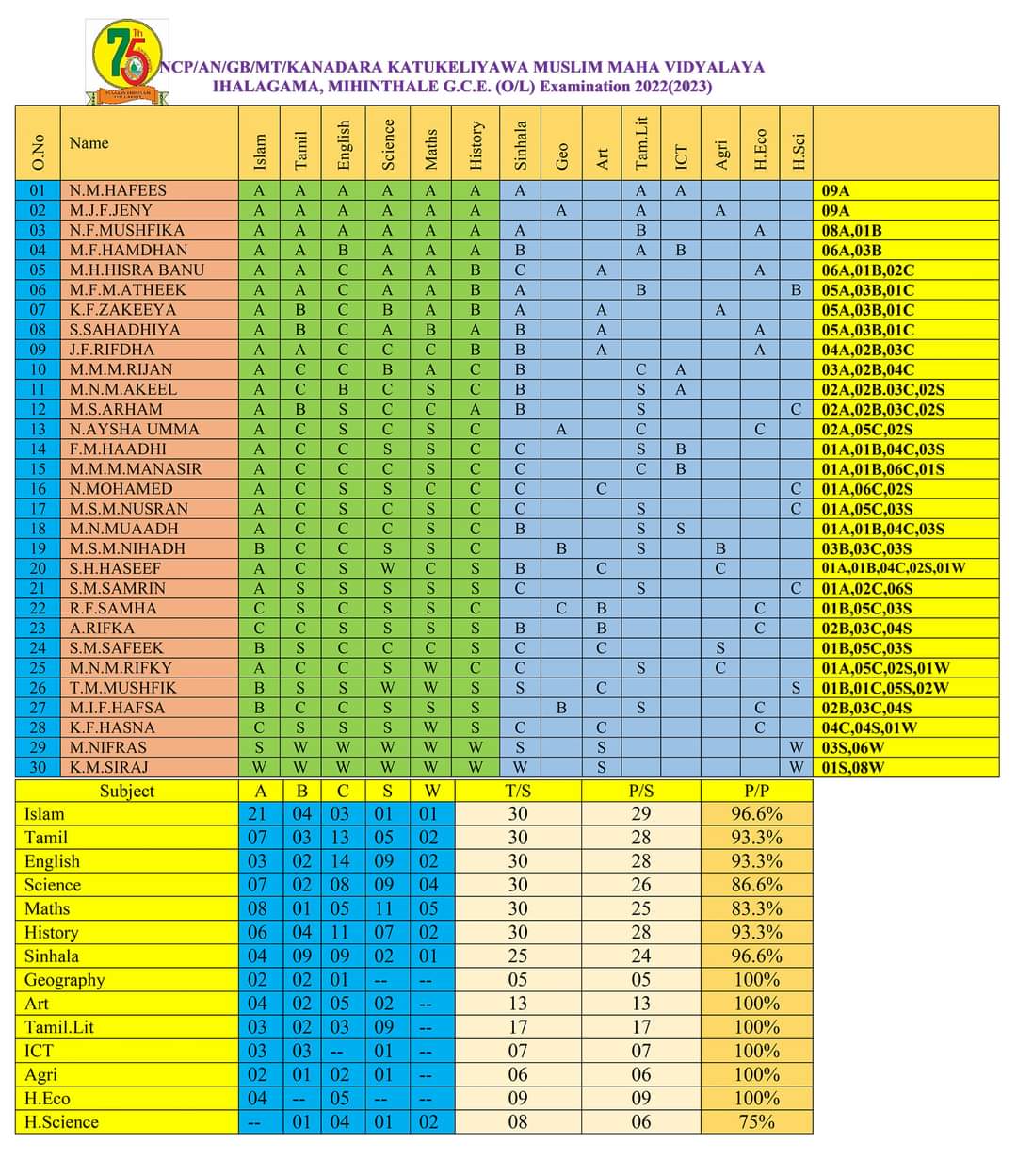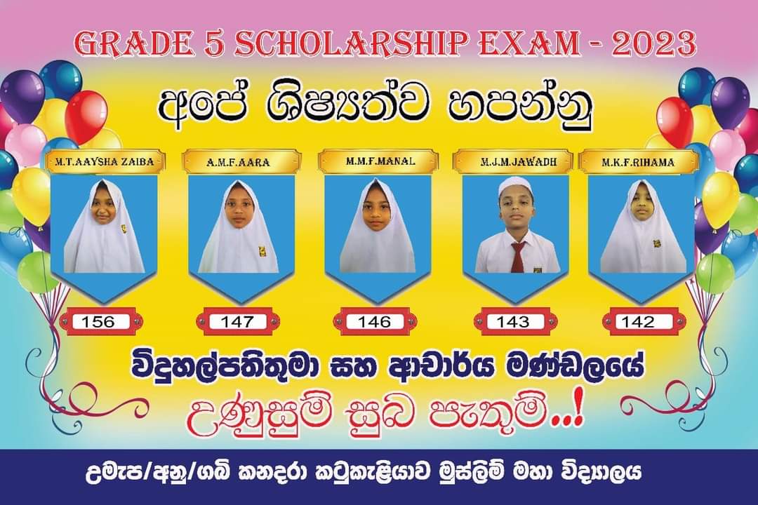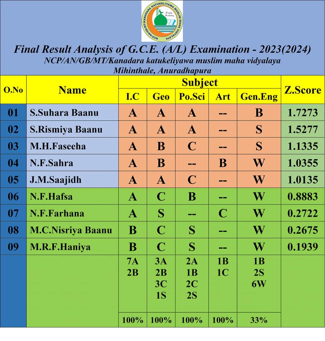 A very proud achievement in the G.C.E ol examination 2022(2023) two students got 9A namely (N.M.HAFEES, J.JENY) and one student got 08 A and one B PASS. and the G.C.E(A/L) Examination 2023/2024 two students got three 3A pass in the Arts Stream. namely (S.SUHRA BAANU, S.RISMIYA BAANU)